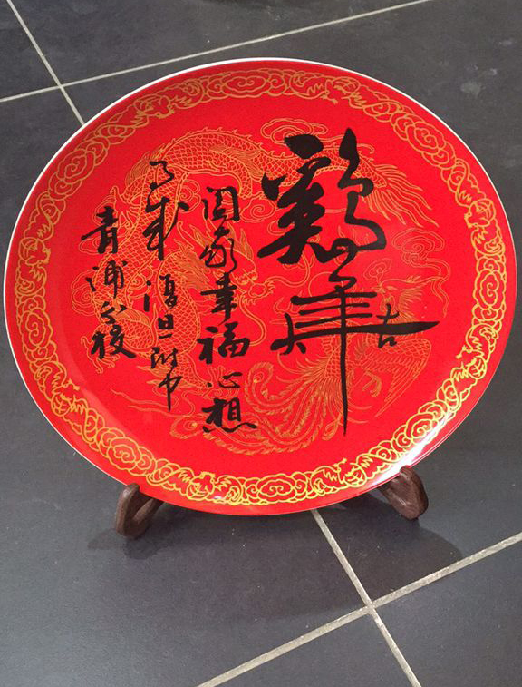 該陶瓷紀念盤整體大紅,寓意整年紅紅火火,另外還提字,祝闔家幸福,心想事成,下面可以欣賞一下這款陶瓷紀念盤。