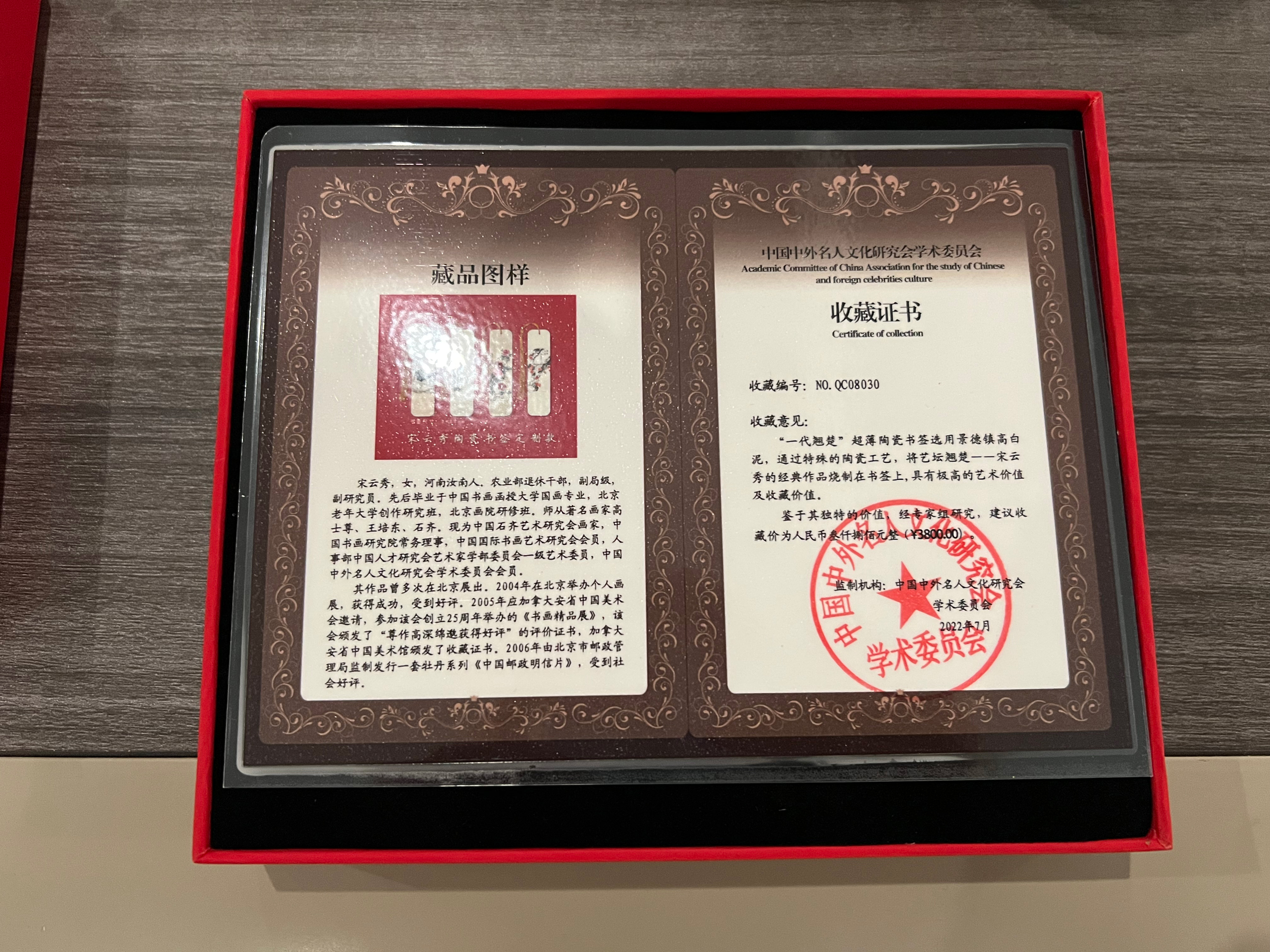 這樣的“一代翹楚”的作品,我們采用了景德鎮(zhèn)高白泥制成超薄陶瓷書簽,通過特殊的陶瓷工藝,將藝壇翹楚宋云秀的經(jīng)典作品燒制在書簽上,經(jīng)鑒定其具有極高的藝術(shù)價值和收藏價值。