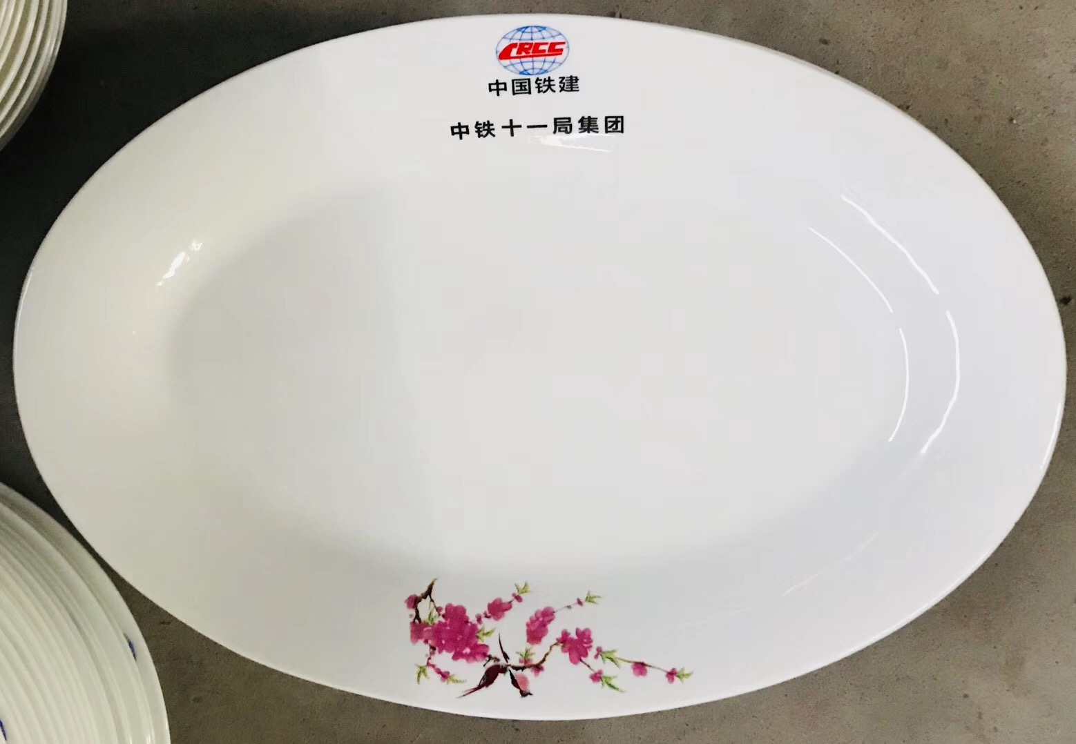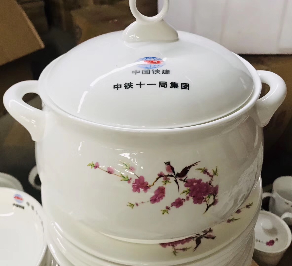 中鐵十一局集團(tuán)定制餐具,這次定制的餐具圖案一支梅花,畫面中鐵十一局商標(biāo),產(chǎn)品有魚盤,深盤,煲,碗,小蝶,杯子,定制的餐具出品圖如下: